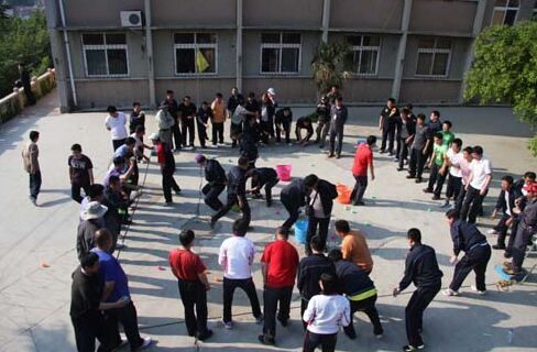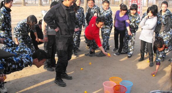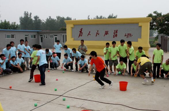 培训方式: 四个小组派组长出来石头、剪刀、布的PK,本组队员按组长PK的胜负次序分别站在40分、30分、20分、10分桶所在象限的外边线外。另外各组派一名队员站在本组在的象限内负责拣球,其他人负责把本组的球通过反弹地面一次的形式将球尽量多的投进桶内。