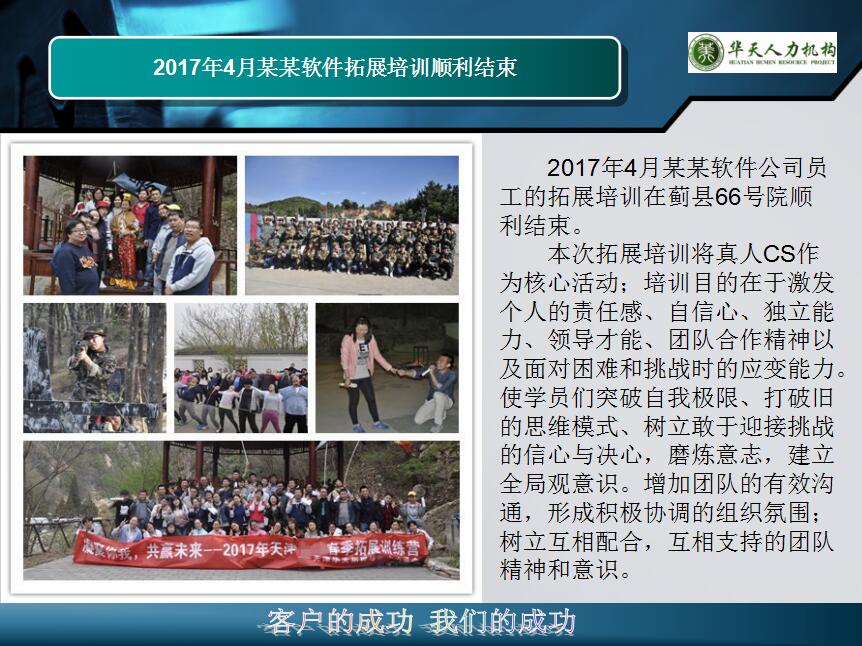 2017年4月某某软件公司员工的拓展培训在蓟县66号院顺利结束。 本次拓展培训将真人CS作为核心活动;培训目的在于激发个人的责任感、自信心、独立能力、领导才能、团队合作精神以及面对困难和挑战时的应变能力。使学员们突破自我极限、打破旧的思维模式、树立敢于迎接挑战的信心与决心,磨炼意志,建立全局观意识。增加团队的有效沟通,形成积极协调的组织氛围;树立互相配合,互相支持的团队精神和意识。
