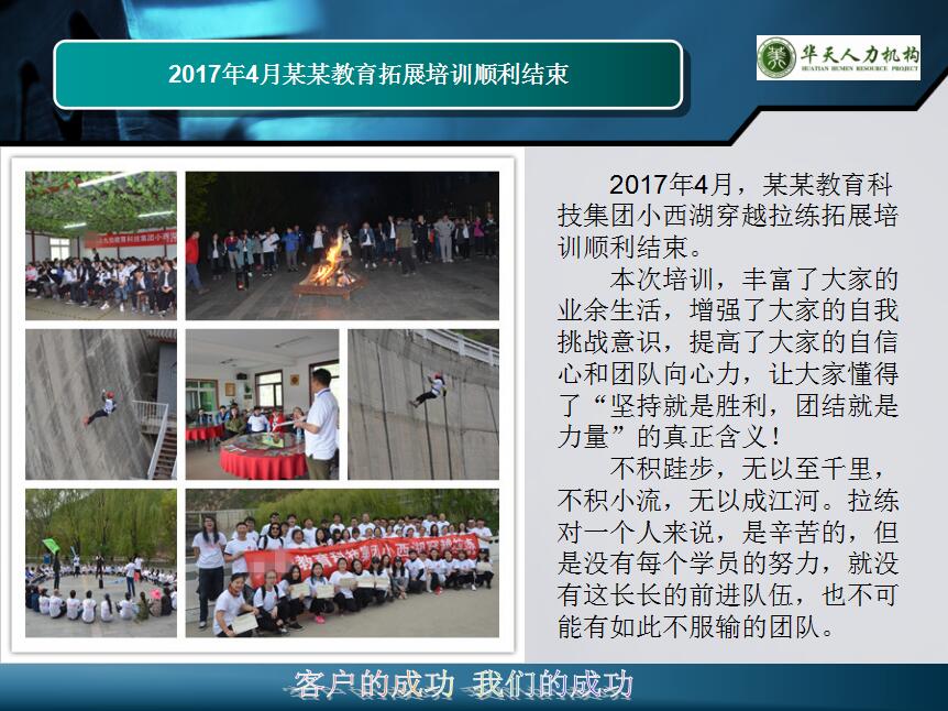 2017年4月,某某教育科技集团小西湖穿越拉练拓展培训顺利结束。 本次培训,丰富了大家的业余生活,增强了大家的自我挑战意识,提高了大家的自信心和团队向心力,让大家懂得了“坚持就是胜利,团结就是力量”的真正含义! 不积跬步,无以至千里,不积小流,无以成江河。拉练对一个人来说,是辛苦的,但是没有每个学员的努力,就没有这长长的前进队伍,也不可能有如此不服输的团队。