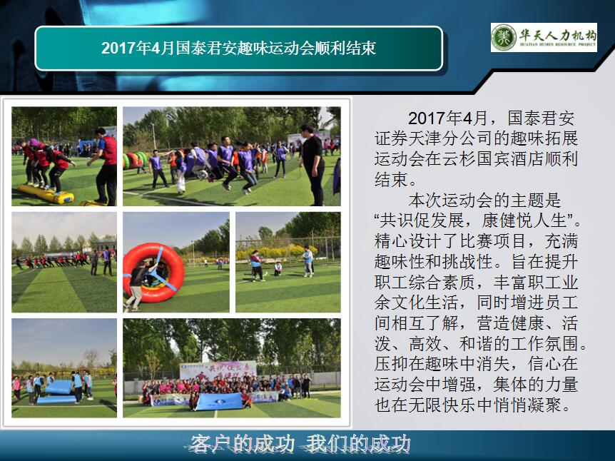 2017年4月,国泰君安证券天津分公司的趣味拓展运动会在云杉国宾酒店顺利结束。 本次运动会的主题是“共识促发展,康健悦人生”。精心设计了比赛项目,充满趣味性和挑战性。旨在提升职工综合素质,丰富职工业余文化生活,同时增进员工间相互了解,营造健康、活泼、高效、和谐的工作氛围。压抑在趣味中消失,信心在运动会中增强,集体的力量也在无限快乐中悄悄凝聚。