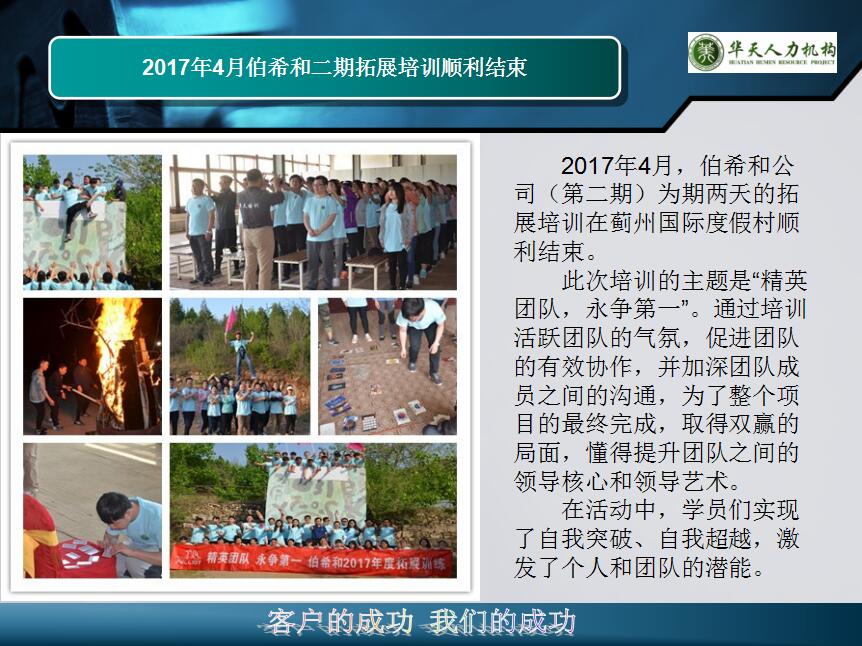 2017年4月,伯希和公司(第二期)为期两天的拓展培训在蓟州国际度假村顺利结束。 此次培训的主题是“精英团队,永争第一”。通过培训活跃团队的气氛,促进团队的有效协作,并加深团队成员之间的沟通,为了整个项目的最终完成,取得双赢的局面,懂得提升团队之间的领导核心和领导艺术。 在活动中,学员们实现了自我突破、自我超越,激发了个人和团队的潜能。