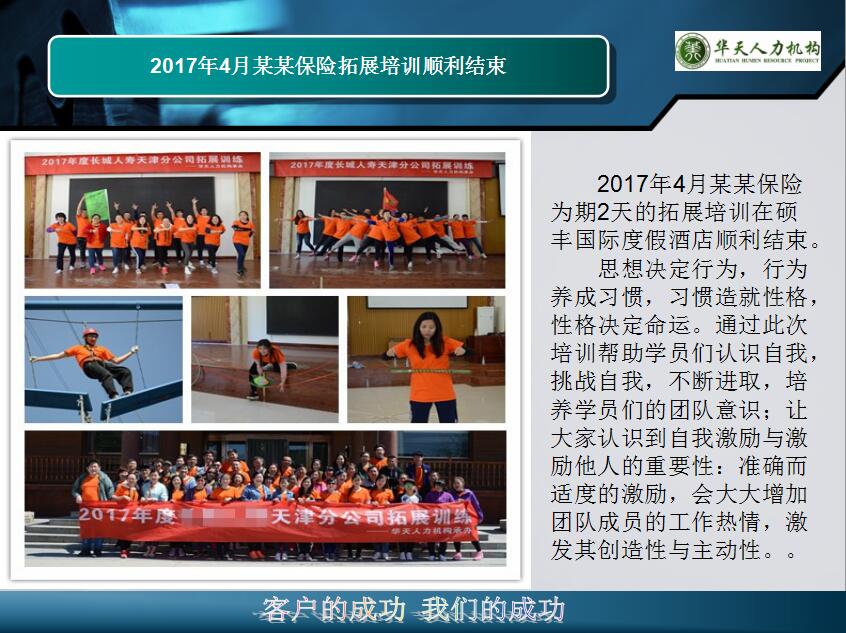2017年4月某某保险为期2天的拓展培训在硕丰国际度假酒店顺利结束。 思想决定行为,行为养成习惯,习惯造就性格,性格决定命运。通过此次培训帮助学员们认识自我,挑战自我,不断进取,培养学员们的团队意识;让大家认识到自我激励与激励他人的重要性:准确而适度的激励,会大大增加团队成员的工作热情,激发其创造性与主动性。