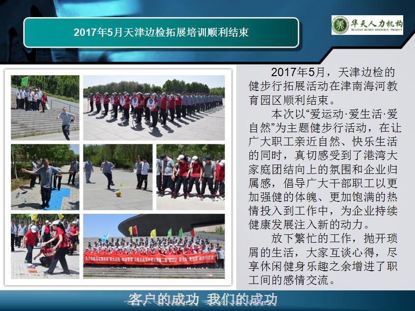 2017年5月,天津边检的健步行拓展活动在津南海河教育园区顺利结束。 本次以“爱运动·爱生活·爱自然”为主题健步行活动,在让广大职工亲近自然、快乐生活的同时,真切感受到了港湾大家庭团结向上的氛围和企业归属感,倡导广大干部职工以更加强健的体魄、更加饱满的热情投入到工作中,为企业持续健康发展注入新的动力。 放下繁忙的工作,抛开琐屑的生活,大家互谈心得,尽享休闲健身乐趣之余增进了职工间的感情交流。