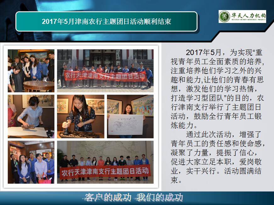 2017年5月,为实现“重视青年员工全面素质的培养,注重培养他们学习之外的兴趣和能力,让他们的青春有思想,激发他们的学习热情,打造学习型团队”的目的,农行津南支行举行了主题团日活动,鼓励全行青年员工锻炼能力。 通过此次活动,增强了青年员工的责任感和使命感,凝聚了力量,提振了信心,促进大家立足本职,爱岗敬业,实干兴行。活动圆满结束。