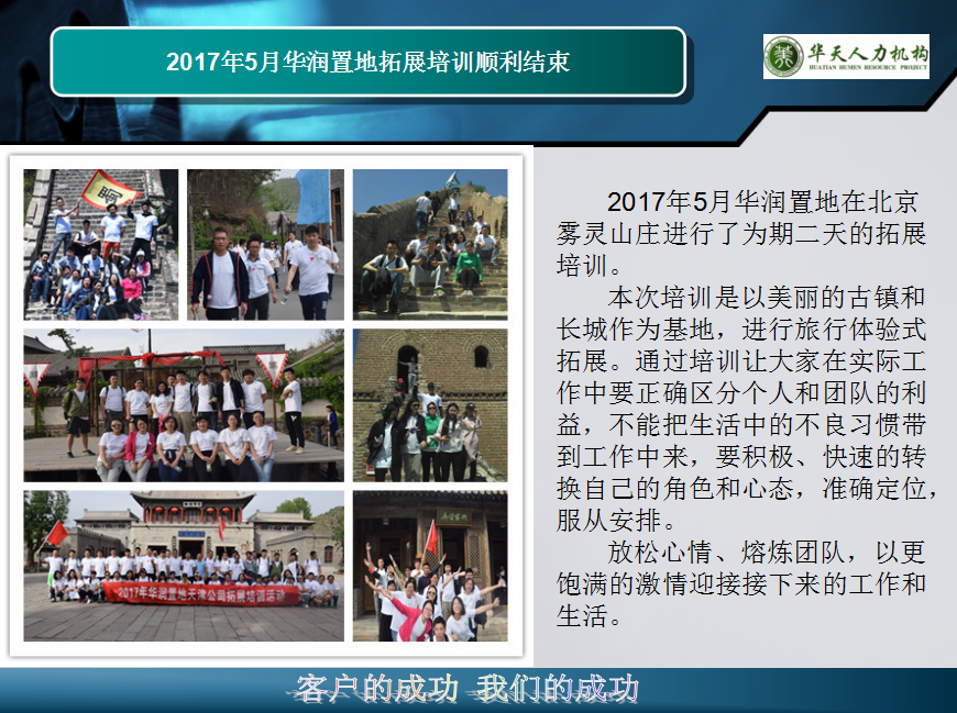 2017年5月华润置地在北京雾灵山庄进行了为期二天的拓展培训。 本次培训是以美丽的古镇和长城作为基地,进行旅行体验式拓展。通过培训让大家在实际工作中要正确区分个人和团队的利益,不能把生活中的不良习惯带到工作中来,要积极、快速的转换自己的角色和心态,准确定位,服从安排。 放松心情、熔炼团队,以更饱满的激情迎接接下来的工作和生活。