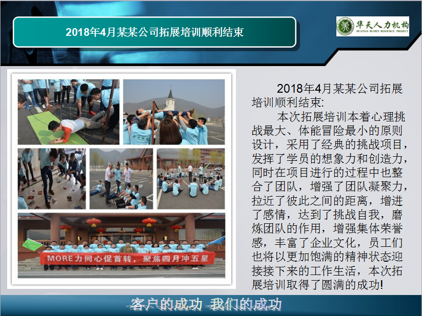 本次拓展培训本着心理挑战最大、体能冒险最小的原则设计,采用了经典的挑战项目,发挥了学员的想象力和创造力,同时在项目进行的过程中也整合了团队,增强了团队凝聚力,拉近了彼此之间的距离,增进了感情,达到了挑战自我,磨炼团队的作用,增强集体荣誉感,丰富了企业文化,员工们也将以更加饱满的精神状态迎接接下来的工作生活,本次拓展培训取得了圆满的成功!
